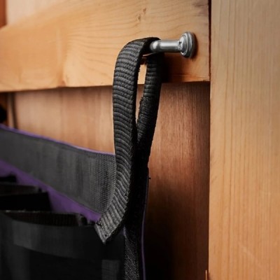 Designed for easy installation, the organizer includes four adjustable hanging straps with fasteners for secure attachment to trailer or stall doors, along with sturdy hooks for versatile mounting options. Made from durable polyester, it is built to withstand daily use whether at home, at shows, or during travel.